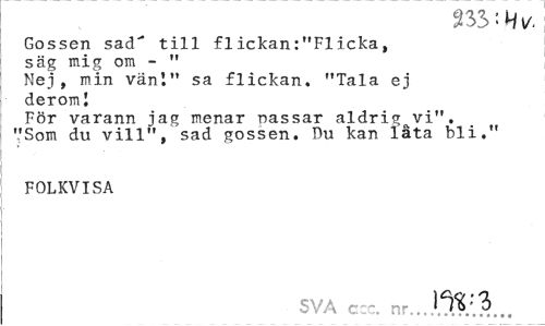 //// Gossen sad" till flickan:"Flicka, //// säg mig om - " //// Nej, min vän!" sa flickan. "Tala ej deroml //// För varann jag menar uassar aldrig vi". VSom du vill", sad gossen. Du kan låta bli." //// FOLKVISA //// SVA c re. nr.. ////