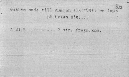 //// Ra //// Gabben sade till gamman sin:"Sätt en lapp på byxan minV,.. //// A 21 i 5---2 str, fragtn.koiB. ////