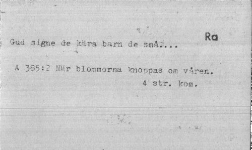 //// Ra //// Gud signe de kära barn de små." . . . //// A 385-2 När blommorna knoppas om våren. //// 4 str. kom. ////