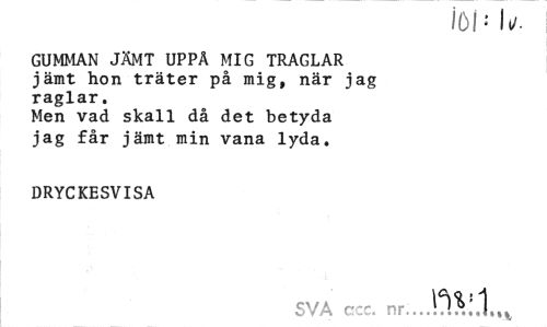 //// löh Ii/. //// GUMMAN JÄMT UPPÄ MIG TRAGLAR jämt hon träter på mig, när jag raglar. //// Men vad skall då det betyda jag får jämt min vana lyda. //// DRYCKESVISA //// SVA c~c. nr...!°!$:.1.,t ////