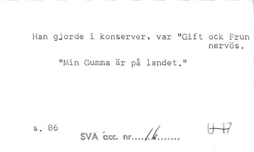 //// Han gjorde i konserver, var "Gift ock Frun //// nervös. //// "Min Gumma är på landet." //// S* 86 c\rK - // tH7 //// SVA ccc. nr.../ir... ////