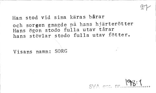 //// Han stod vid sina käras bårar //// och sorgen gnagde pä hans hiärterötter Hans ögon stodo fulla utav tårar hans stövlar stodo fulla utav fötter. //// Visans namn: SORG //// SY* r-r. ////