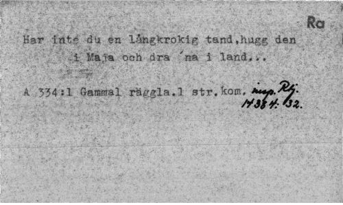 //// Ra //// Har int<? du en långkrokig tand,hugg den • i Ma.i a ooh dra 'na i land,.. //// A 334:1 Gammal räg^la.l atr.fcom. ////