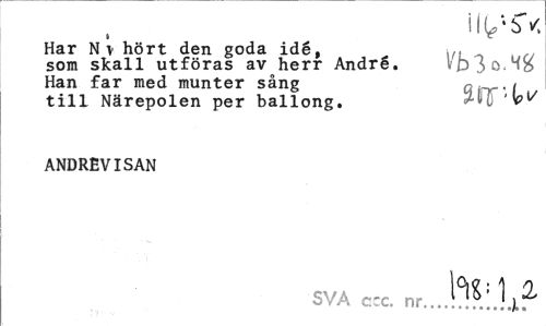 //// i IV sv, //// Har Nv hört den goda idé, UL . //// som skall utföras av herr Andre. vDio.Mö Han far med munter sång Qinr'l //// till Närepolen per ballong. +U 'v" //// ANDREVISAN //// SVA c "c. nr...!^?.|JjL?' ////
