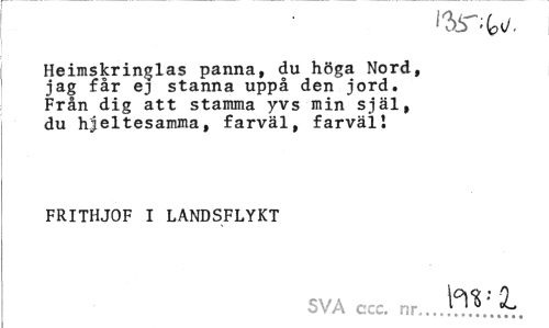//// Heimskringlas panna, du höga Nord, jag får ej stanna uppå den jord. Från dig att stamma yvs min själ, du hjeltesamma, farväl, farväl1 //// FRITHJOF I LANDSFLYKT //// SVA ccc. nr...^!"'..^. ////