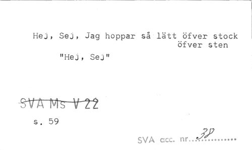 //// Hej, Sej, Jag hoppar så lätt öfver stock //// öfver sten //// "Hej, Sej" //// erfrm^ni //// s. 59 //// SVA ccc. nr...v;f... ////