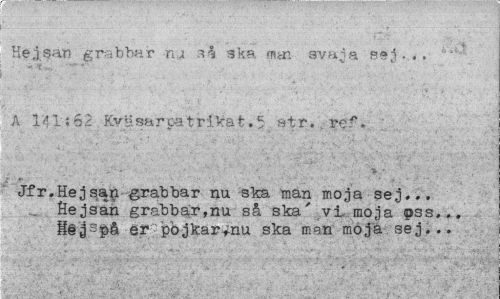 //// Hejsan grabbar nu ska myn svaja sej.., " ' A 1'41-i 62 . KvUsarpatrikat. 5 str.. ref. ; //// Jfr.Hej san grabbar nu ska man moja sej... Hejsan grabbar,nu så ska' vi moja pss... H§33på er pojkar*-nu ska man moja sej... ////