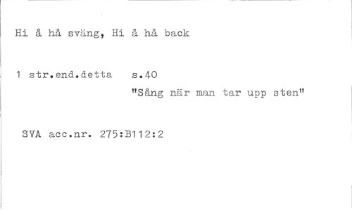 //// Hi å hå sväng, Hi å hå back //// 1 str.end.detta s.40 //// "Sång när man tar upp sten" //// SVA acc.nr. 275:B112:2 ////