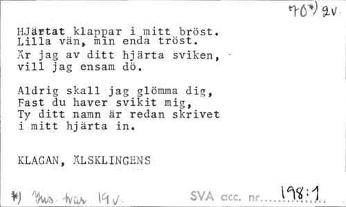 //// TOv.SLv/- //// HJärtat klappar i mitt bröst. Lilla vän, mm enda tröst. //// Är jag av ditt hjärta sviken, • vill jag ensam dö. //// Aldrig skall jag glömma dig, Fast du haver svikit mig, Ty ditt namn är redan skrivet i mitt hjärta in. //// KLAGAN, ÄLSKLINGENS *) \C\J- SVA ccc. nr...lfML\l, ////