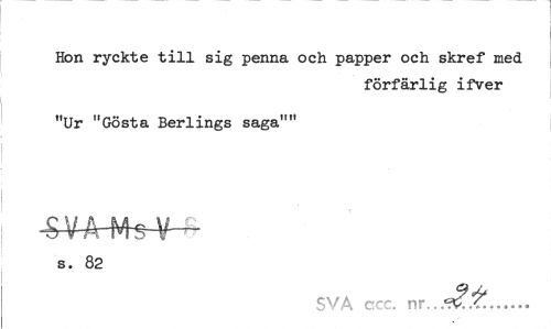 //// Hon ryckte till sig penna och papper och skref med //// förfärlig ifver //// "Ur "Gösta Berlings saga"" —- //// s. 82 //// SVA ccc. nr. .£±... ////