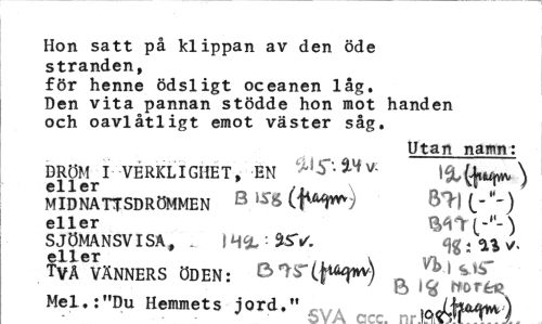 //// Hon satt på klippan av den öde stranden, //// för henne ödsligt oceanen låg. //// Den vita pannan stödde hon mot handen //// och oavlåtligt emot väster såg. //// Utan namn: //// eller* VERKLIGHET, EN ) //// MIDNATTSDRÖMMEN B ifa^J (.- //// eller (-M //// SJÖMANSVISA, . | HSt - &SV. eft y, //// WvÄNNERS ÖDEN: 0 1 //// ' 8 rtortne //// Mel. s »Du Hemmets jord.». ////