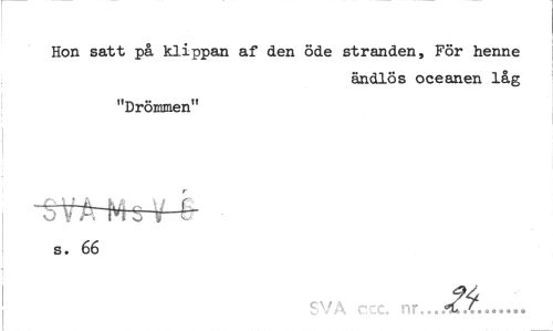 //// Hon satt på klippan af den öde stranden, För henne //// ändlös oceanen låg //// "Drömmen" //// r //// s. 66 //// SVA o.cc. nr... ////