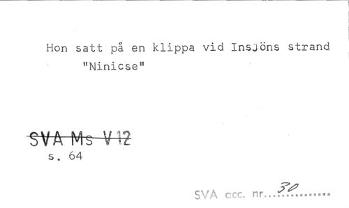 //// Hon satt på en klippa vid Insjöns strand "Ninicse" //// SVA Mj VI? //// s. 64 //// SVA ccc. nr...r!?f... ////