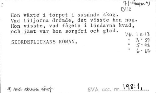 //// "f| •'ttioJlYVM //// Hon växte i torpet i susande skog. Vad liljorna drömde, det visste hon nog. Hon visste, vad fågeln i lundarna kvad, och jämt var hon sorgfri och glad. ^ ^ ^ //// SKÖRDEFLICKANS ROMAN. - V^ //// " i* n " t - //// -*) SVA ccc. nr. ////