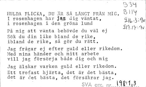 //// HULDA FLICKA, DU ÄR SÄ LÅNGT FRÄN MIG. ^ 1'V I rosenhagen har jag dig väntat, Qu //// i rosenhagen i den gröna lund ~ „ //// På mig att vanta behövde du väl ej Sök du din like bland de rike, ibland de rike, så gör du rätt. //// Jag frågar ej efter guld eller rikedom. Med mina händer och mitt arbete vill jag försörja både dig och mig //// Jag älskar varken guld eller rikedom. Ett trofast hjärta, det är det bästa, det är det bästa, det försäkrar jag. //// SVA //// srrr nr //// IU'1,3 ////