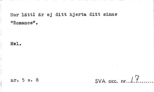 //// Hur lätti är ej ditt hjerta ditt sinne "Romance". //// Mel. //// ^ nr. 5 s. 8 SVA ccc. nr... ////