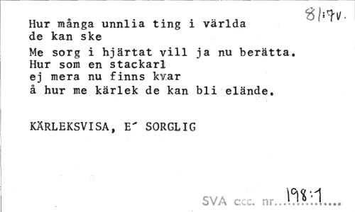 //// Hur mänga unnlxa ting i varlda de kan ske //// Me sorg i hjärtat vill ja nu berätta. Hur som en stackarl ej mera nu finns kvar å hur me kärlek de kan bli elände. //// KÄRLEKSVISA, E' SORGLIG //// SVA ccc. ////