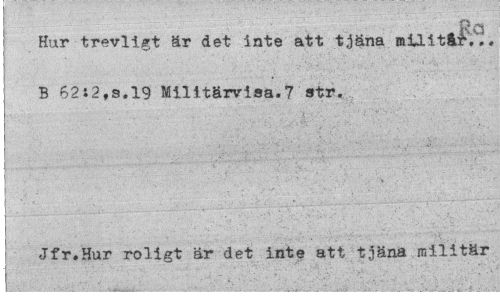 //// Res //// Hur trevligt är det inte att tjäna mil i tår.'.. B 62:2fs.l9 Militärvisa.1 str. //// Jfr.Hur roligt är det inte att tjäna militär ////