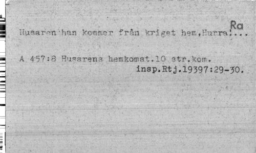 //// SRa //// Uusar^n•han kommer fran kriget hem,Hurra!... ¦ A 4'57sQ Husarens hemkomst.10.3tr.kom. //// " insp.Rtj.19397:29-30. ////