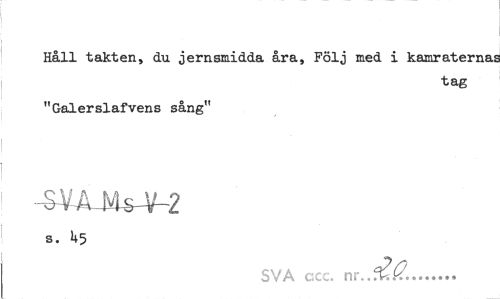 //// Håll takten, du jernsmidda åra, Följ med i kamraternas //// tag //// "Galerslafvens sång" //// -MAMsrAHl //// s. U5 //// SVA ccc. ... ////