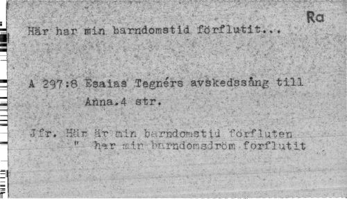 //// J X Ra //// j. Här har min barndomstid förflutit... //// 5 A 297:8 Esaias Tegnérs avskedssång till 5 Anna.4 str. //// Jfr. Här är nin barndomstid förfluten //// M ¦ " bar aif! Kr. rndon si rom förflutit //// =11 • ; ' ¦ •' ¦ ; • ' ¦ • ; . . ' . " v ¦• -v-fy - //// - ////