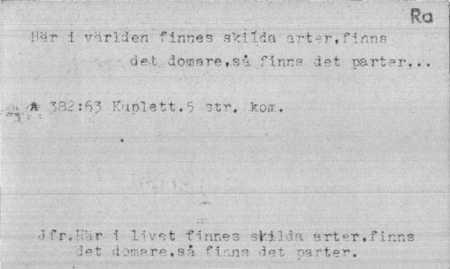 //// Ra //// H^r i världen finnes skilda ar t-r, finns //// det domare ».så finns det parter... //// , A 332:63 Kuplett.5 str. kom. //// ¦ - ' " ' //// ? //// Jfr. Har i livet finnes skilda arter ..finns jet domare.så finns det parter. ////