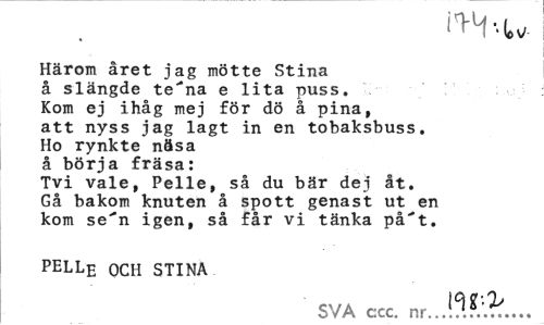 //// IT-4--W //// Härom året jag mötte Stina å slängde te"na e lita puss. Kom ej ihåg mej för dö å pina, att nyss jag lagt in en tobaksbuss. Ho rynkte näsa å börja fräsa: //// Tvi vale, Pelle, så du bär dej åt. Gå bakom knuten å spott genast ut en kom se'n igen, så får vi tänka på't. //// PELLB OCH STINA //// SVA ccc. nr...!?.?.'.^... ////