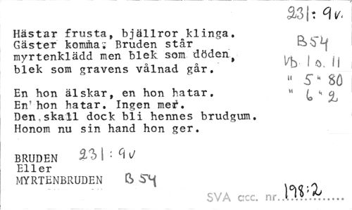 //// S3|: ^ //// Hästar frusta, bjällror klinga. D _ //// Gäster komitia.- Bruden står 1 //// myrtenklädd men blek som döden. ^ blek som gravens vålnad går. //// " 5 * 80 //// En hon älskar, en hon hatar. " ^ << a //// En' hon hatar. Ingen mei1. Den,skall dock bli hennes brudgum. Honom nu sin hand hon ger. //// BRUDEN Eller //// MYRTENBRUDEN C> //// SVA ccc. ... ////