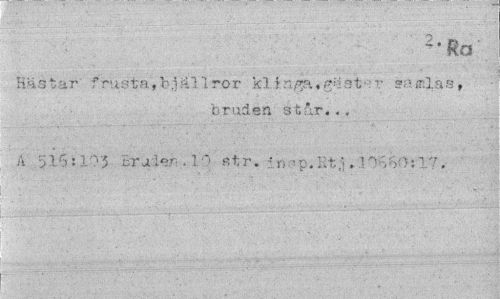 //// Hastar frusta,bjällror kl inga,g» st : t samlas, //// bruden står... //// A 516:103 Bruden/lo str. in >p.Kt;». .10660:17, ////