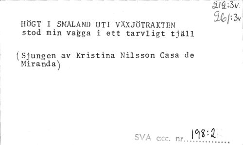 //// HÖGT I SMÅLAND UTI VÄXJÖTRAKTEN stod min va£ga i ett tarvligt tjäll //// (Sjungen av Kristina Nilsson Casa de Miranda) //// SVA ccc. nr. J^ ////