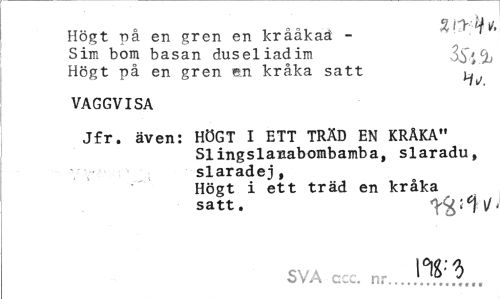 //// Högt på en gren en krååkaä - " ' ^ * //// Sim bom basan duseliadim 3y % //// Högt på en gren en kråka satt .' //// Ii/. //// VAGGVISA //// Jfr. även: HÖGT I ETT TRÄD EN KRÅKA" //// Slingslanabombamba, slaradu, slaradej, //// Högt i ett träd en kråka satt. //// SVA ccc. nr...!0^... ////