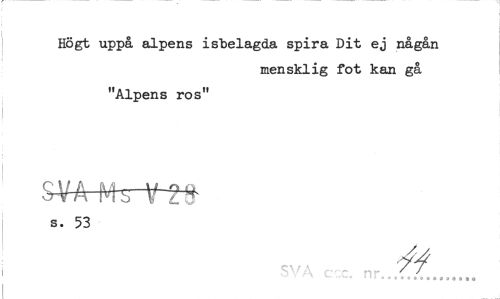 //// Högt uppå alpens isbelagda spira Dit ej någån //// mensklig fot kan gå //// "Alpens ros" //// s. 53 //// SVA , n ^ ////