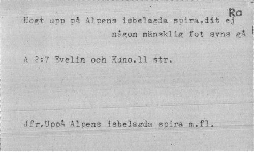 //// Ro //// Högt upp r*. Alpens i abelagda spira, dit ej //// någon mänsklig fot syns gå //// A 2t? Evelin och Kuno.11 str, //// Jfr,tippa Alpens isbela^da spira m.fl. ////