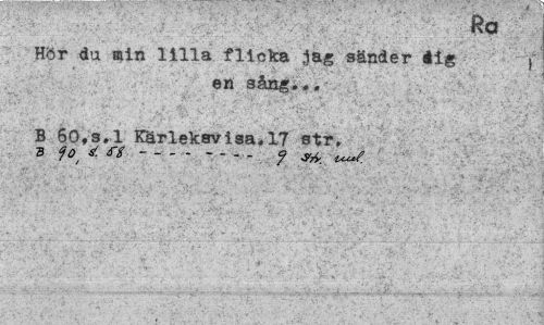 //// Hör da aln lilla flicka jag sänder éig { //// en sång... //// B 60,3.1 Kärlekavisa.17 str. //// 3 fa J. ff--- ? ////