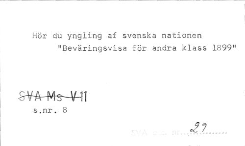 //// Hör du yngling af svenska nationen //// "Beväringsvisa för andra klass 1899" //// s.nr. 8 //// oo / ////