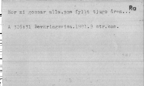 //// Ra //// Hor ni gossar alla,son fyllt tjugo aren... //// ' A 326:31 Béväringsvisa. 1'^°]. ? str.kom. //// i 1 //// 3 //// ...L... //// ] ¦ ////