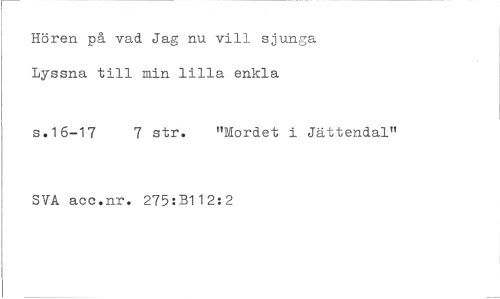 //// Hören på vad Jag nu vill sjunga Lyssna till min lilla enkla //// s.16-17 7 str. "Mordet i Jättendal" SVA acc.nr. 275:B112:2 ////