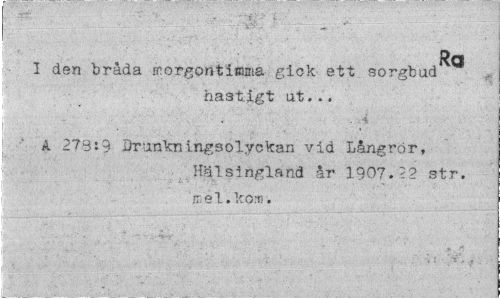 //// Ro //// I den bråda morgontimma gick ett sorgbud //// hastigt ut... //// A 279:9 Drunkningsolyckan vid Långrör, //// Hälsingland år 1907.?2 str. rr. el. korn. ////