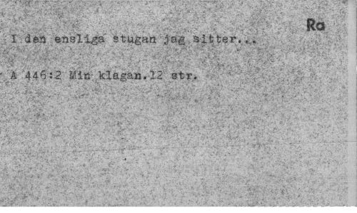 //// * • ¦ //// f ^y v RO //// - I:den ensliga stugan jag sitter... //// A 446:2 Miö klagan.12 str. //// . .C ' ^ , ; - " - V" . « ^ ¦ 1 ; ' ¦ //// v*. - «: ¦ v -.. ¦¦.. > . ' //// : ' „ . ' ¦ : ' //// ' V ;. T: ,-v-.-'¦,*' /;,¦¦/ .. i"; //// 4 1 ¦ 'V: ..-'V;" . > '. '"¦!..• . ? 1 - . ' V-." ." , y.-; ¦¦».'¦ //// yiiä '-"V .'"V '*¦ ¦¦¦ J ¦ ¦ " . ;> ¦ tv-• - . //// i '''v'''•;v. ' •;...•':.¦.. ¦ i .-'H^y-y.., ' .. ".-..".'v,.-» //// .., >-. /.: .- - . . •; - ¦¦ ¦¦ ?. - . //// Sffil^^^Ki^iyfflHK» HK • Mfe M1 - MååmiM, feÄSfeK il: ////