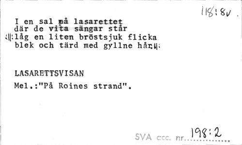 //// i . //// I en sal på lasarettet där de vita sängar står il('.låg en liten bröstsjuk flicka blek och tärd med gyllne hår.l|; //// LASARETTSVISAN Mel.:"På Roines strand". //// SVA ccc nr ^ ////