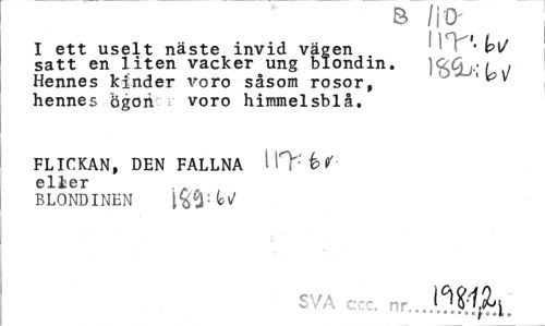//// » /ru- //// I ett uselt näste invid vägen satt en liten vacker ung blondin. Hennes kinder voro såsom rosor, J>bv //// hennes ögon r voro himmelsblå. //// FLICKAN, DEN FALLNA l l& eller //// BLONDINEN //// SVA c---, nr Wt^i //// ...f*- ////