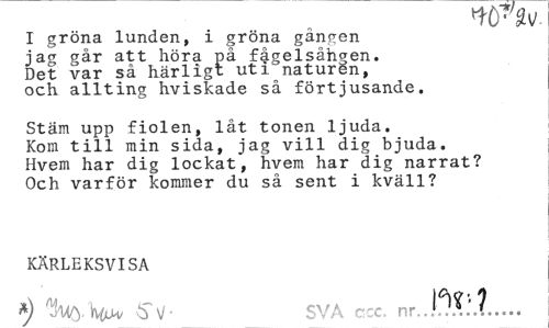 //// I gröna lunden, i gröna gänrren jag går att höra på f<|gelsåhgen. Det var så härligt uti naturen, och allting hviskade så förtjusande. //// Stäm upp fiolen, låt tonen ljuda. Kom till min sida, jag vill dig bjuda. Hvem har dig lockat, hvem har dig narrat? Och varför kommer du så sent i kväll? //// KÄRLEKSVISA //// *) SVA ccc. nr.J^X:.?... ////