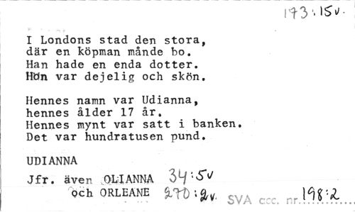 //// 11-3 '. is»/- //// I Londons stad den stora, där en köpman månde bo. Han hade en enda dotter. Hön var dejelig och skön. //// Hennes namn var Udianna, hennes ålder 17 år. Hennes mynt var satt i banken. Det var hundratusen pund. //// UDIANNA //// Jfr. även OLIANNA //// öch QRLEANE \%Hl $yA co ////