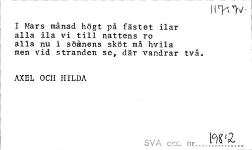 //// UT.V //// I Mars månad högt på fästet ilar alla ila vi till nattens ro alla nu i söånens sköt må hvila men vid stranden se, där vandrar två. //// AXEL OCH HILDA //// SVA ccc. nr...M!??-... ////