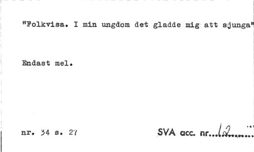 //// "Folkvisa. I min ungdom det gladde mig att sjunga1 Endast mel. //// 1 //// nr. 34 s. 2Y SVA acc. nr //// UL ////