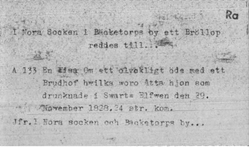 //// ; : . Ra //// I fora- 800kan 1 Bäoketorps by ett Bröllop reddes tlll.i'^^- //// A. 133 En Éfsa Om ett 'olyckligt öde med ett Brud.hof h^ilka »oro åtta b.ion som drunknade i S-vart* T5;lf«/en den j?9. ¦ - yaIfo^rember 182B, 24 str. kom*-. Jfr. I 'Nora sookeå och Bsnketo.rps ty... ////