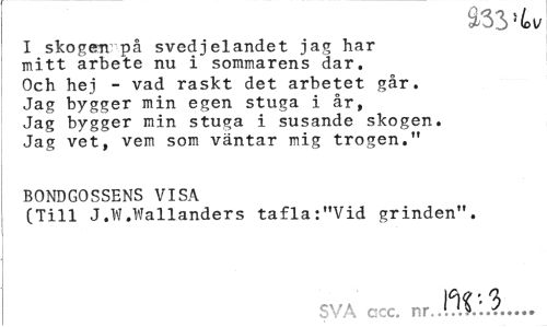 //// 5 U //// I skogen på svedjelandet jag har //// mitt arbete nu i sommarens dar. //// Och hej - vad raskt det arbetet går. //// Jag bygger min egen stuga i år, //// Jag bygger min stuga i susande skogen. //// Jag vet, vem som väntar mig trogen." //// BONDGOSSENS VISA //// (Till J.W.Wallanders tafla:"Vid grinden". //// SVA ccc. nI.?... ////