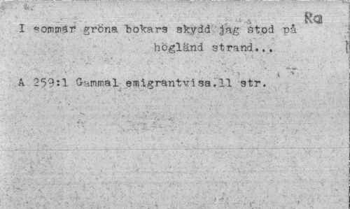 //// . Ka //// I «omm<sr gröna bokars skydd jag stod på //// högland strand... //// A 259:1 Gammal emigrantvisa.il str. ////