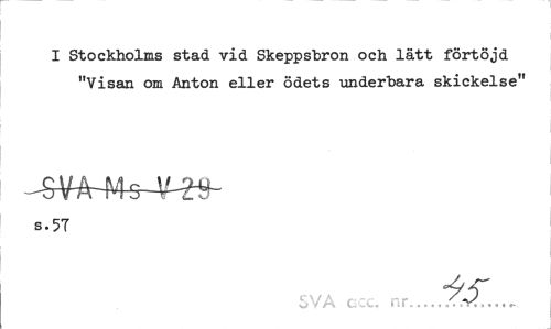 //// I Stockholms stad vid Skeppsbron och lätt förtöjd "Visan om Anton eller ödets underbara skickelse" //// s. 57 //// SVA t nr... ////