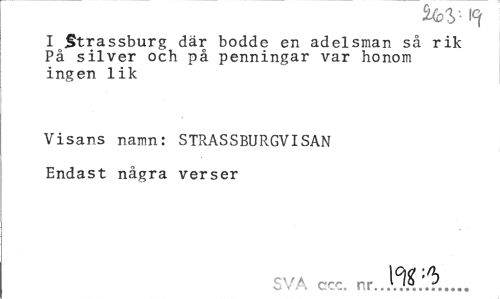 //// I Strassburg där bodde en adelsman så rik På silver och på penningar var honom ingen lik //// Visans namn: STRASSBURGVISAN Endast några verser //// SVA ccc. nr..!^.'.^... ////